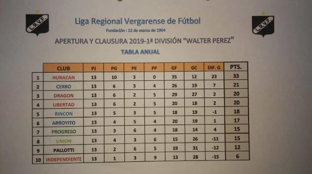 TABLA DE POSICIONES LIGA REGIONAL VERGARENSE DE FUTBOL.